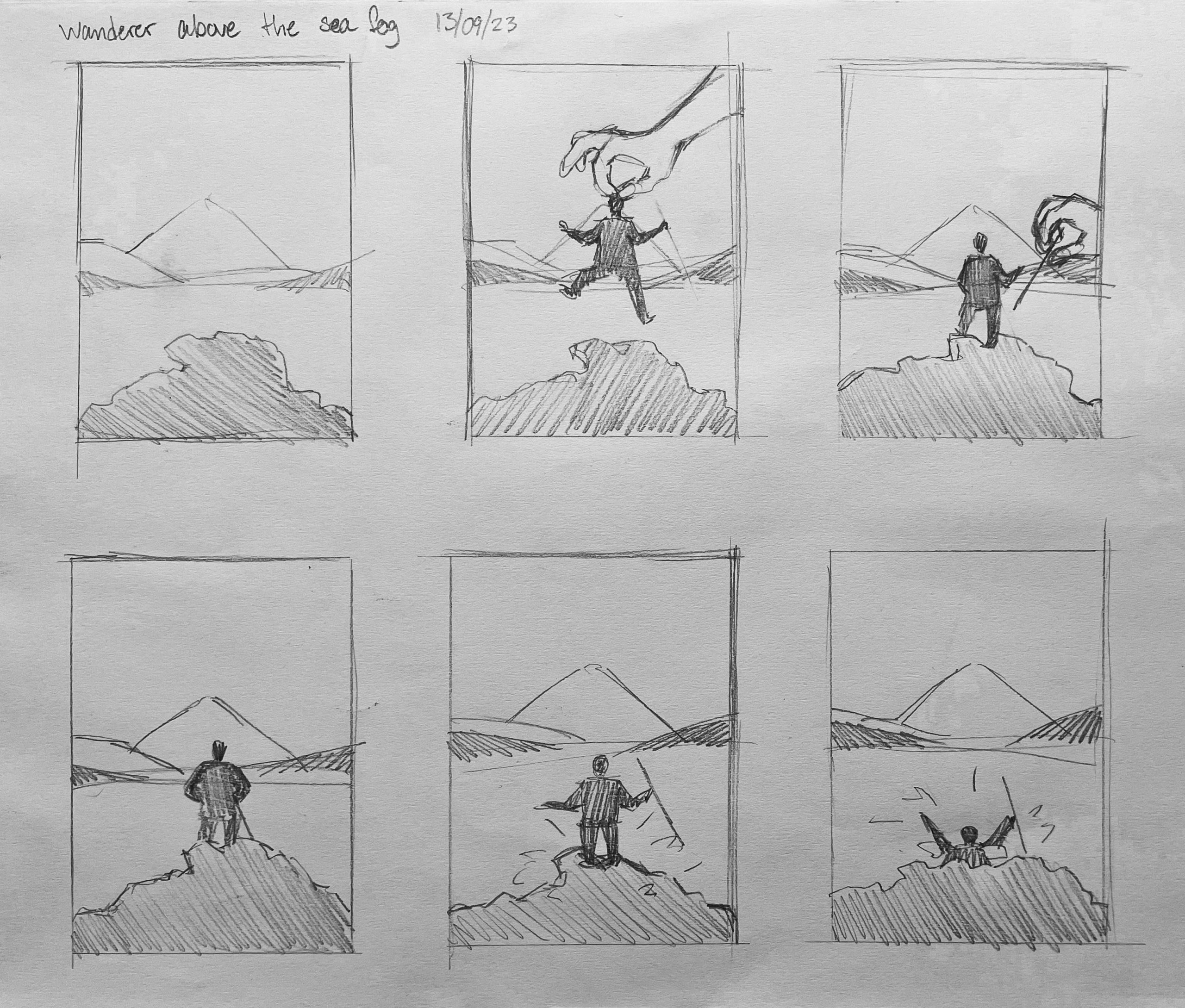 Jeg havde nogle idéer om at animere manden klatre op ad klipperne, men så tænkte jeg, at det kunne være sjovere hvis klippestenen brød sammen, så både manden og stenen faldt i havet. Jeg lavede et hurtigt storyboard, for at få en generel idé om forløbet i min animation.