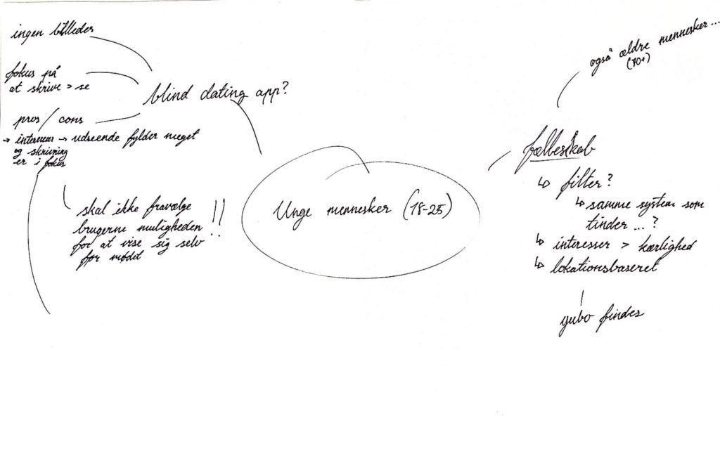 Min gruppe og jeg startede med at diskutere og brainstorme idéer til dating apps rettet mod de forskellige målgrupper. Først snakkede vi om at designe en app til hunde. Her snakkede vi om at man bl.a. kunne lave en hunde-parring app eller en app for hundeejere der søger en hundepasser. Derefter prøvede vi også at brainstorme idéer til en app for unge mennesker (18-25), hvor vi først fik idéen til at lave en blind-dating app, altså en app hvor man matcher baseret på interesser og derefter skal skrive sammen før man kan se billeder af hinanden. Til sidst fandt vi frem til idéen om at lave en app for unge mennesker der føler sig ensomme og gerne vil finde en gruppe af andre unge mennesker som de kan dyrke deres interesser og hobbyer med. Denne idé blev vi ret glade for, så den valgte vi at udvikle videre på.