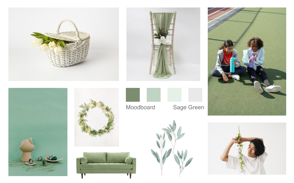 Efter vi havde brainstormet, gik vi igang med at lave et moodboard i Adobe XD (vi brugte Adobe XD til hele projektet. Vi besluttede fra starten af at vi gerne ville bruge en grøn farve som gennemgående tema i appen. Vi valgte at gå efter mere “støvede” og blålige grønne, for ikke at give en følelse af bæredygtighed og/eller miljøvenlighed, da det ikke var vores fokus med appen. Vi valgte også de her farver, fordi de virker rolige og afslappende, hvilket vi gerne ville udtrykke, da appen handler om at finde nye venner og fællesskaber uden nogen romantisk hensigt.