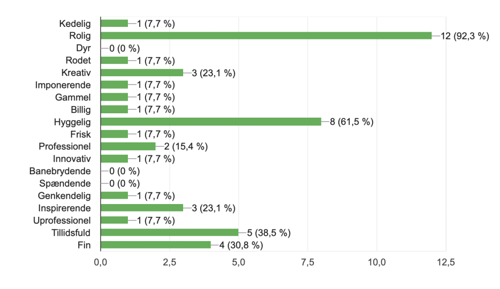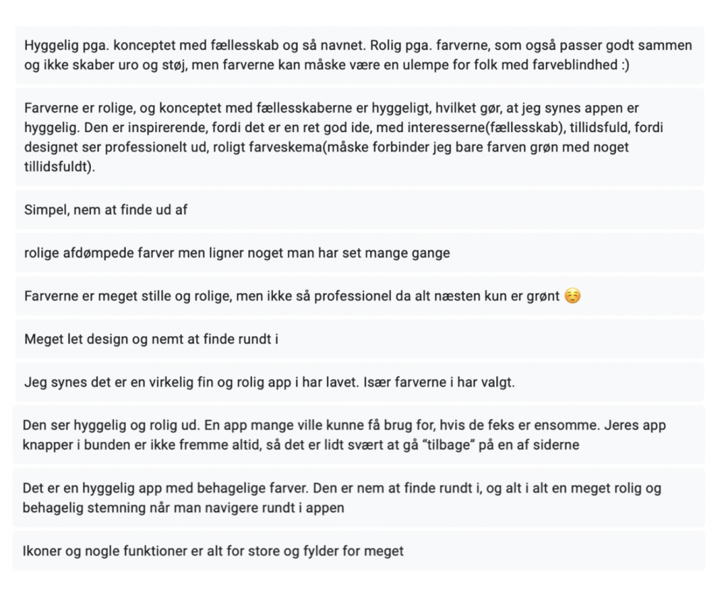 Ud fra resultaterne kunne vi se at folk generelt havde en positiv response til appen. De fleste syntes at appen var rolig og hyggelig, hvilket også var det vi gik efter. Men der var selvfølgelig stadig ting der kunne forbedres. I de kommentarer vi fik, blev der bl.a. nævnt at der ikke var nok kontrast mellem de farverne, hvilket kunne være en udfordring for farveblinde, plus at appen virkede uprofessionel fordi alt kun var grønt. Der blev også nævnt at nogle af funktionerne var alt for store og fyldte for meget.