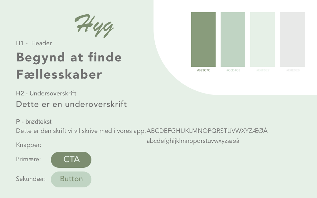 Det var her vi fandt frem til at kalde vores app “Hyg”, da den alligevel er baseret i Danmark. Til logoet brugte vi fonten Brush Script MT, da vi syntes den passede til den stemning og følelse vi gik efter. Til alt andet tekst på appen valgte vi at bruge fonten avenir, da den er letlæselig og fungerer godt til både header, overskrifter og brødtekst. På den måde behøvede vi ikke at bruge flere forskellige fonte, hvilket kan give appen et rodet udseende. Vi fandt frem til de farver vi primært ville bruge på appen, dog endte vi med senere hen at udskifte nogle af farverne med sort og hvid. Til knapperne valgte vi at bruge den mørkegrønne farve til de primære knapper (de knapper vi gerne vil have brugeren skal trykke på) og en mere lys og støvet grøn til de sekundære knapper.