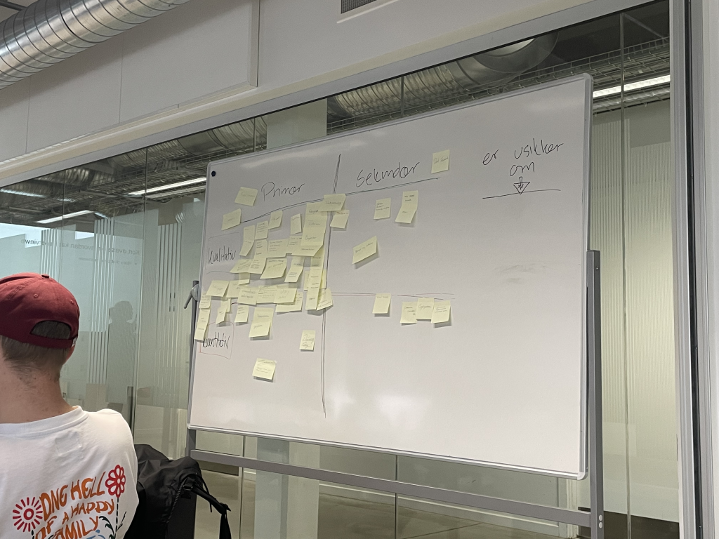 Derefter satte vi alle vores post-its op på et white-board, hvor de blev sorteret efter om det var primær eller sekundær research, og om det kvantitativt eller kvalitativt.