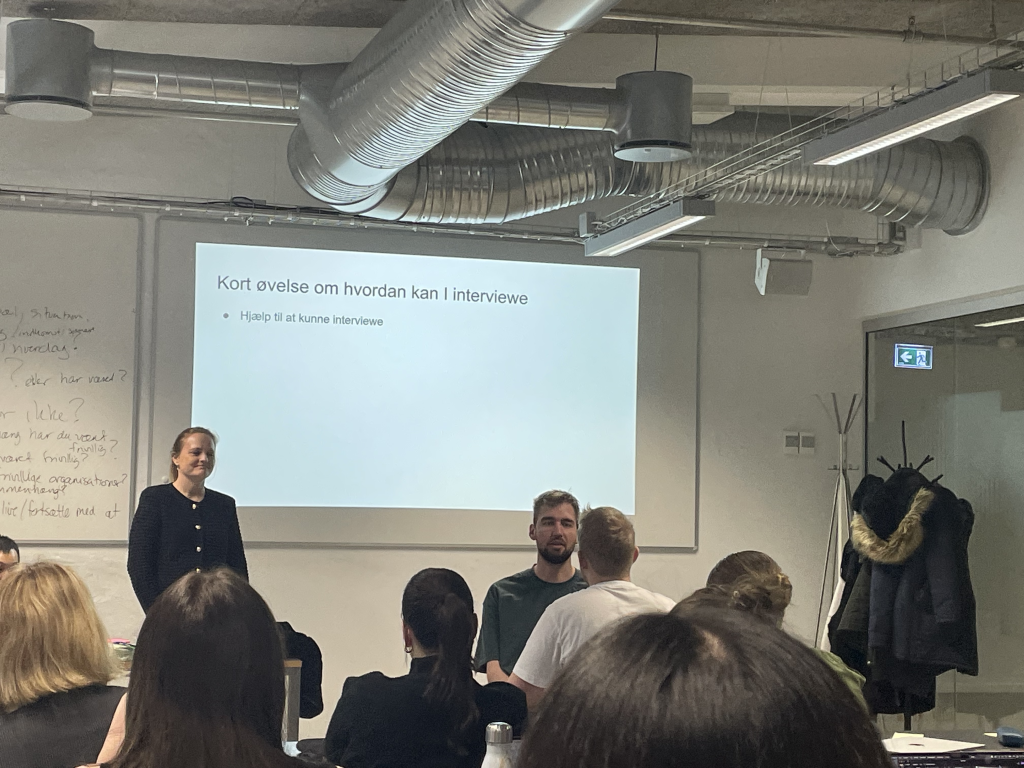 Efter vi havde sorterede og snakkede om de forskellige typer research på vores post-its, lavede vi alle en fælles øvelse, hvor én fra klassen blev udvalgt til at interviewe og en anden skulle så være den der blev interviewet.