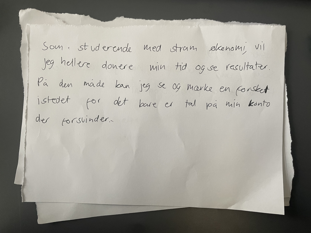 Personen der skulle interviewes gik ud på gangen og ventede, i mens underviserne og resten af klassen diskuterede hvilke spørgsmål vi skulle stille. Her lød opgaven at vi havde en målgruppe som bestod af unge i aldersgruppen 20-25 år, hvor vi så skulle undersøge hvor mange i vores målgruppe der var eller havde været involveret i velgørenhedaktiviteter.