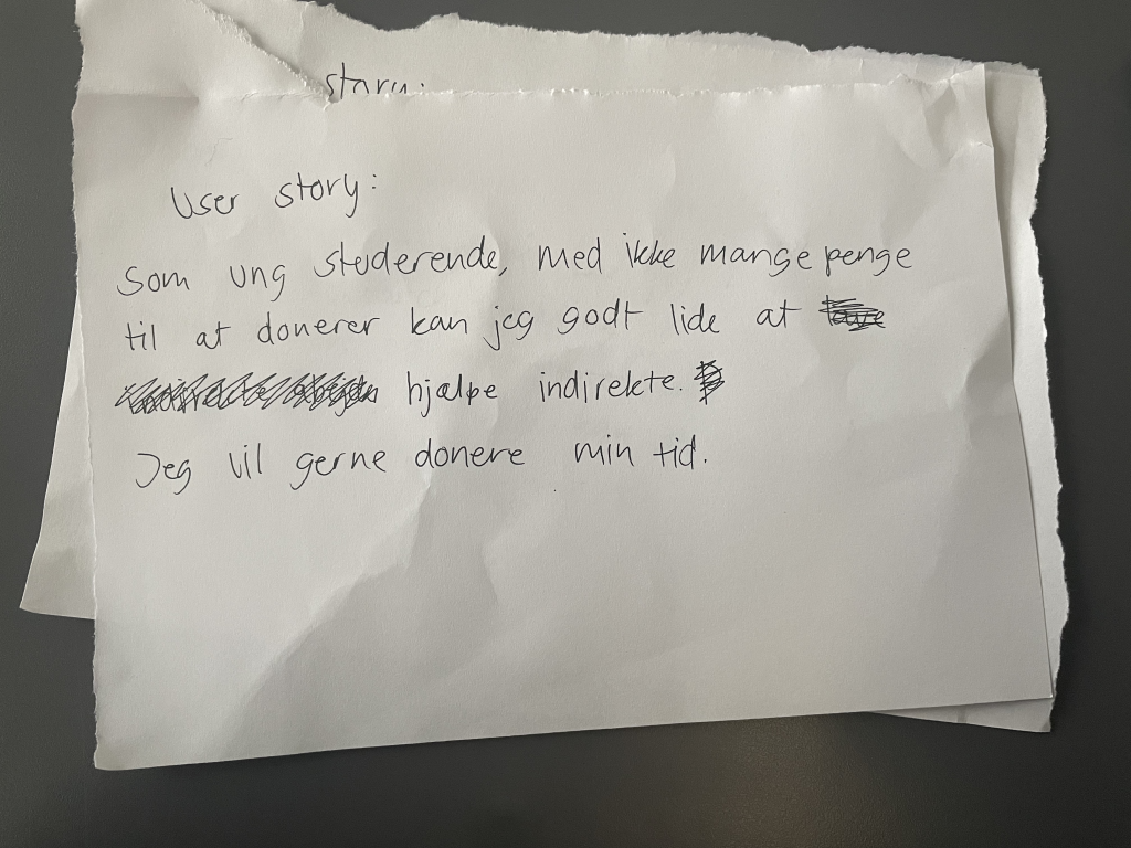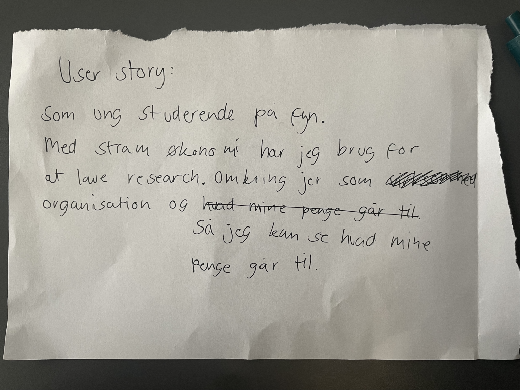 Til sidst i workshoppen skulle vi skrive nogle user stories, baseret på de her tendenser vi havde fundet og kategoriseret. Vi endte med at lave 3 user stories, og skrev dem alle ned på papir: