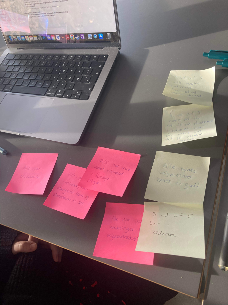 Til at starte med kiggede vi vores data igennem, dvs. noterne fra de interviews vi havde lavet, for at finde nogle tendenser i dem. Det var for eksempel sådan noget som: “3 bor i Odense”, eller “2 ud af 5 har ikke været involveret i frivilligt arbejde”. Vi skrev alle tendenserne ned på post-its.