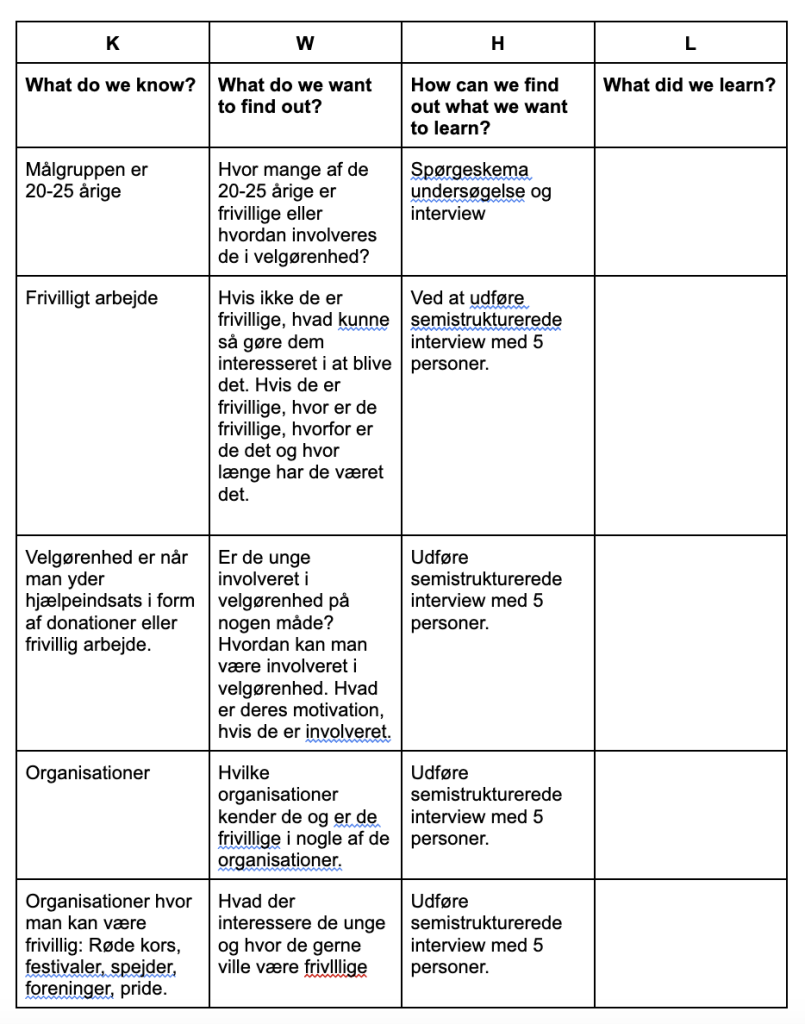 Til at starte med lavede vi en KWHL, som vi også havde omkring på 1. semester, hvor vi skrev hvad vi allerede vidste, derefter hvad vi gerne ville undersøge og til sidst hvordan vi kunne undersøge det.