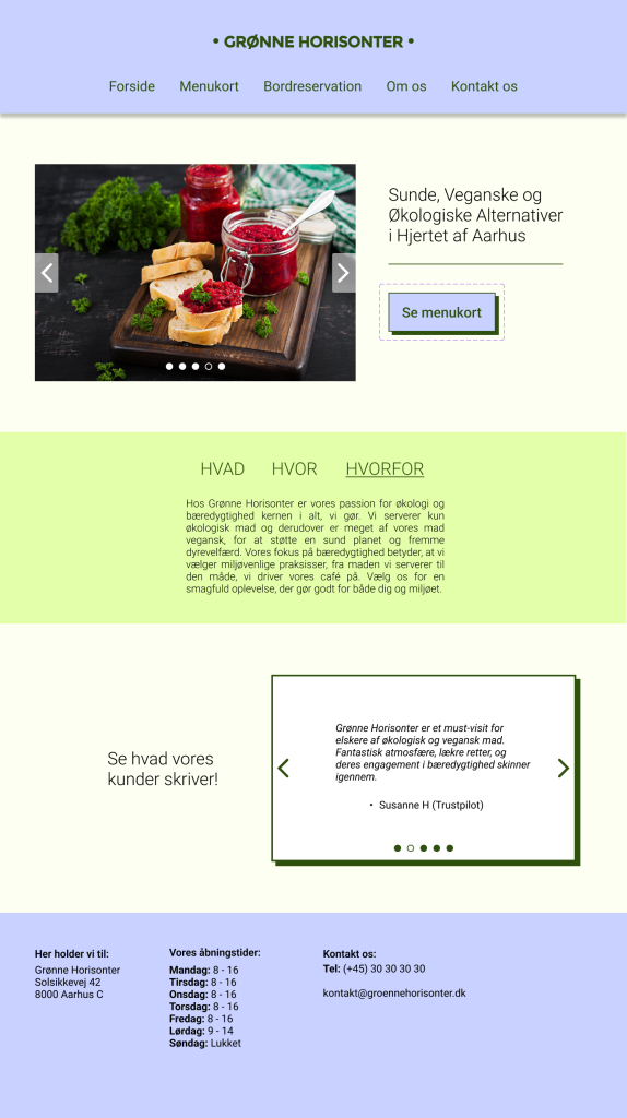 Opgave: Udvikl et intuitivt website layout for caféen, med fokus på online menu, bordreservation og interaktive elementer om bæredygtighed.