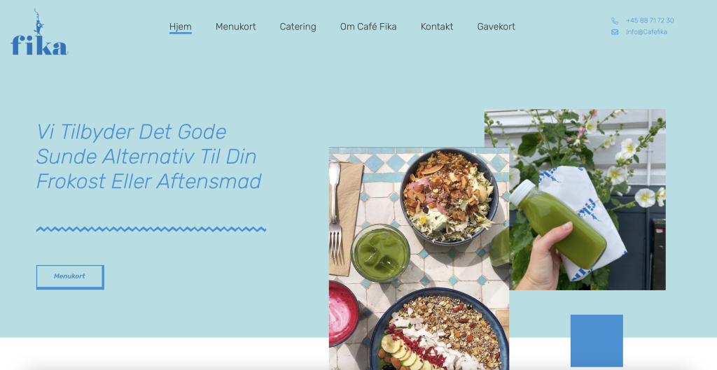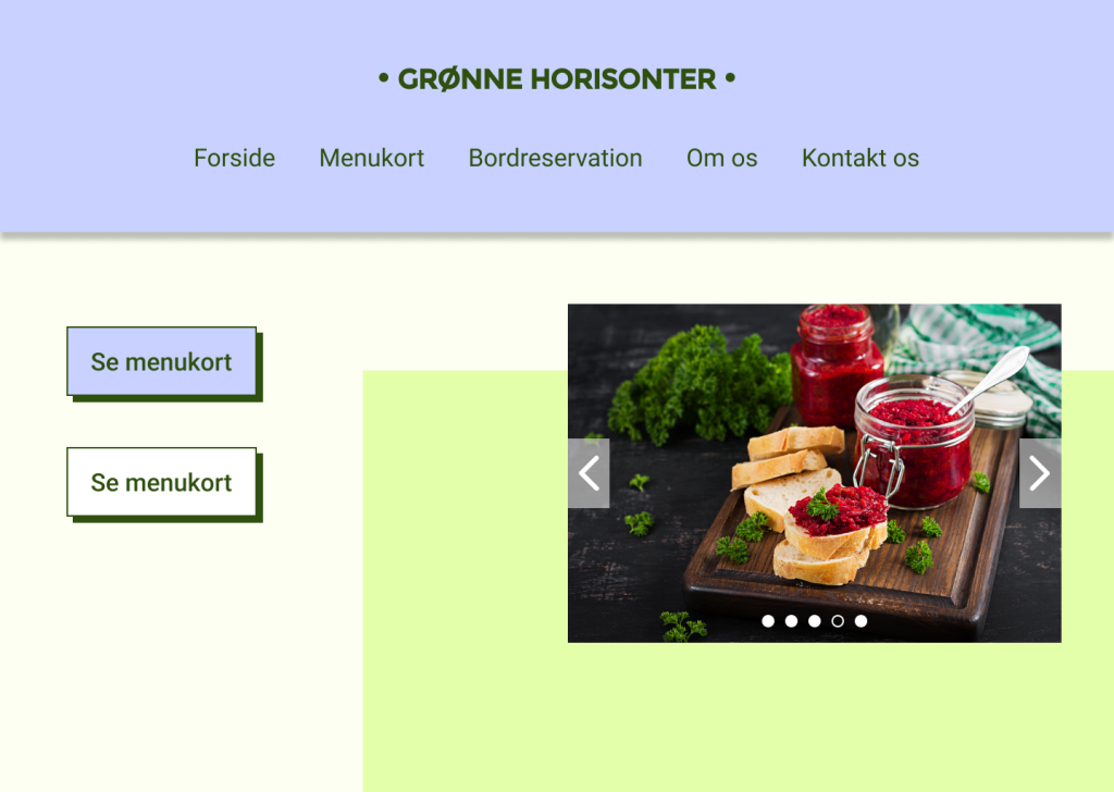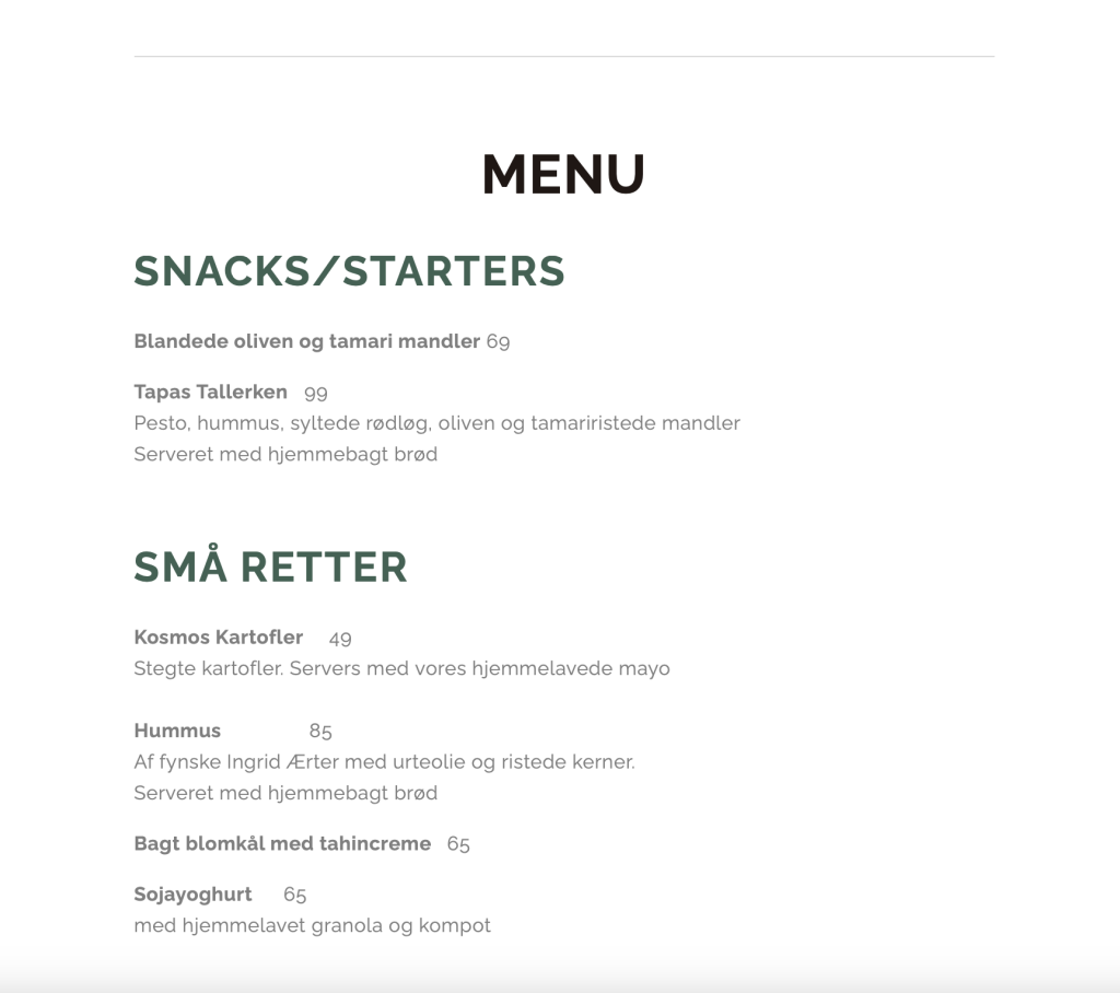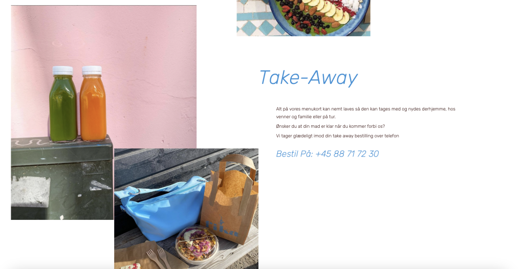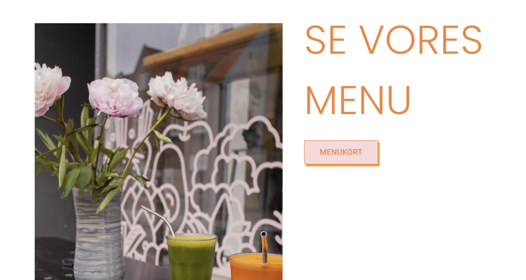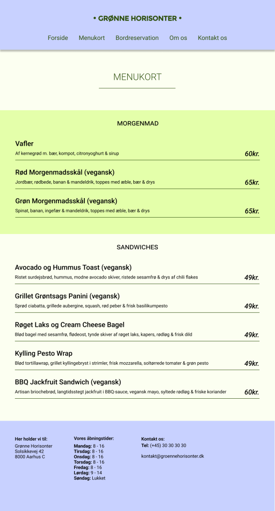 Jeg gik først i gang med at lave noget visuel research, hvor jeg undersøgte forskellige caféers hjemmesider, både lokale og i Aarhus, som går op i bæredygtighed og/eller servere vegansk mad. Her undersøgte jeg primært hvordan de havde designet deres menukort og bordreservation.