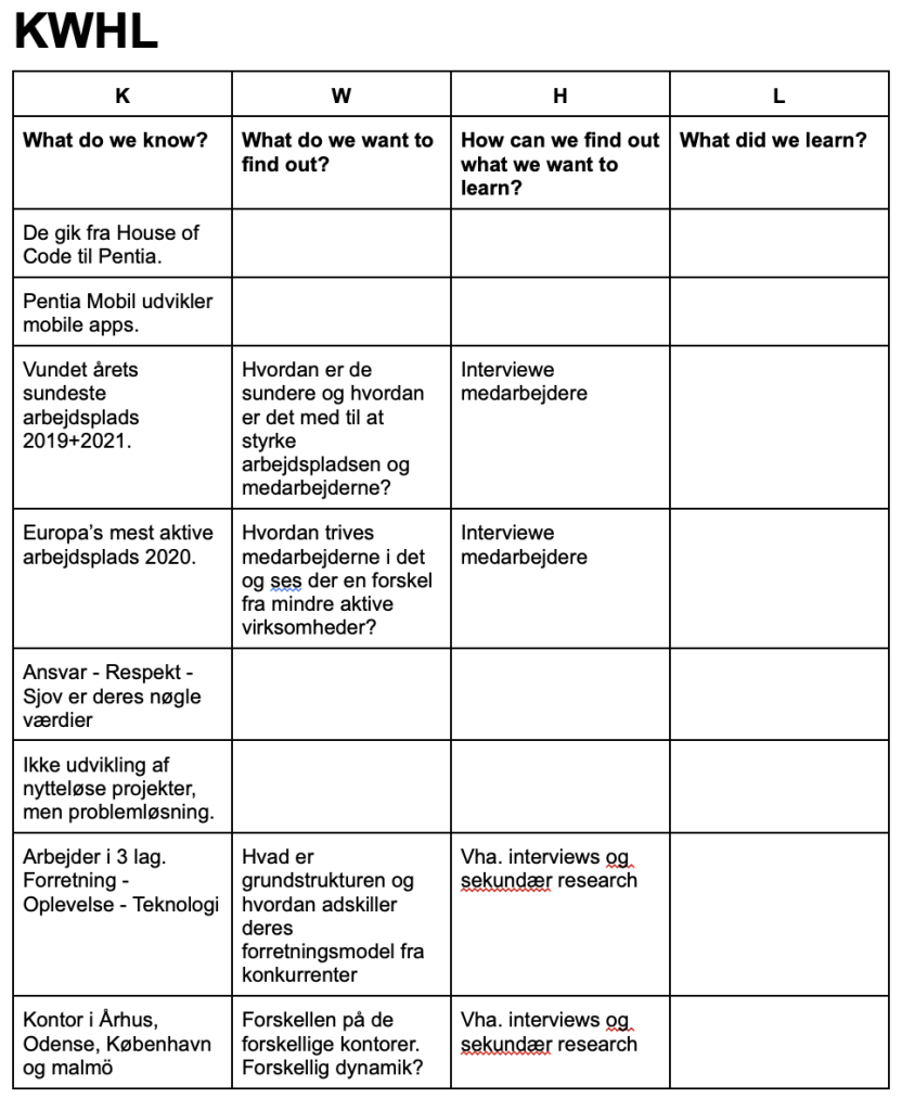 Denne uge startede med, at vi havde booket et lokale hos Pentia, hvor vi sad og arbejdede hele mandagen. På den måde fik vi mulighed for at stille nogle spørgsmål til Emily og Henrik, samt få et indtryk af stemningen i hos Pentia. Derudover lavede vi også et spørgeskema, som vi sendte ud på Facebook og Instagram, samt personer, som vi tænkte var målgruppen. Resten af ugen blev brugt på at lave en masse research omkring vores målgruppe, hvilket er jobsøgende/praktisksøgende inden for it- og hr-branchen, samt virksomheder der kunne være mulige klienter hos Pentia Mobile. Vi lavede også en masse research på selve Pentia, Pentia Mobile og deres historie. Inden vi begyndte på research, startede vi på en KWHL, for at få et overblik over hvad vi egentlig skulle undersøge.