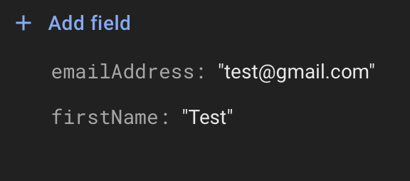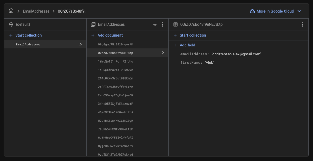Først oprettede jeg et projekt inde i Firebase, hvorefter jeg opsatte min firestore database, med en kollektion ved navn “EmailAddresses”, hvor dokumenterne har to fields: “firstName” og “emailAddress”, som begge er string-typer.