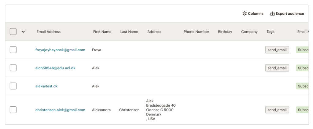 Desværre så virkede det ikke og det billede jeg har vist tidligere af min liste på Mailchimp, kan man se at nogle af de mails der står, har fået tagget “send-email”, men det var kun fordi at jeg manuelt gav dem tagget, inde på Mailchimp.