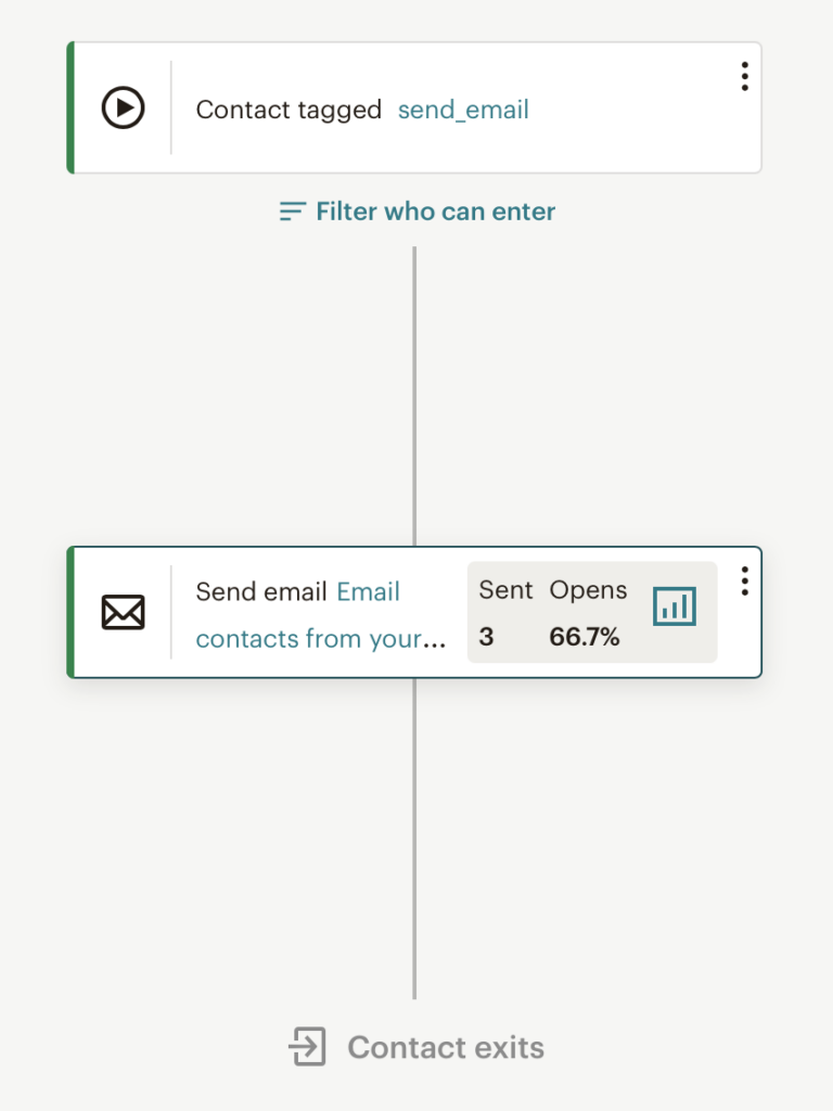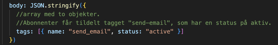 Og derudover ændrede jeg det til at mails nu skulle blive tildelt tagget “send_email” med en status på “active”. Det gjorde jeg, fordi at jeg inde på Mailchimp havde rodet lidt rundt med at lave et såkaldt automation-flow, som blev triggeret ved at data på min liste var tagget med “send_email”, hvorefter de mails der så havde det tag, ville få tilsendt en mail, som jeg så også designede inde i Mailchimp.
