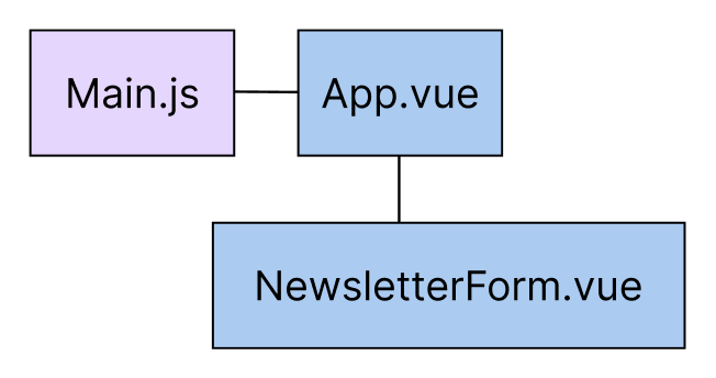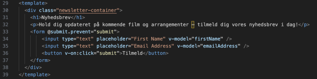 Så jeg oprettede mit vue-projekt og derefter lavede jeg blot ét dokument, kaldet NewsletterForm.vue. Det er så det her komponent som indeholder mine input-felter, hvor man kan skrive navn og mail, samt en tilmeld-knap. Derefter undersøgte jeg, hvordan jeg kunne lave en funktion inde i mit komponent, som gør at den tekst-værdi der bliver skrevet ind i input-felterne, bliver gemt i en firestore database, efter man trykker på knappen.