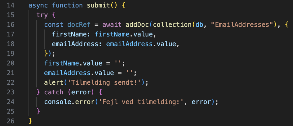 Derefter lavede jeg en asynkron funktion inde i min NewsletterForm.vue, som tilføjer et dokument inde i min kollektion “EmailAdresses”, som så indeholder den strint-værdi man har skrevet ind i mine inputfelter.