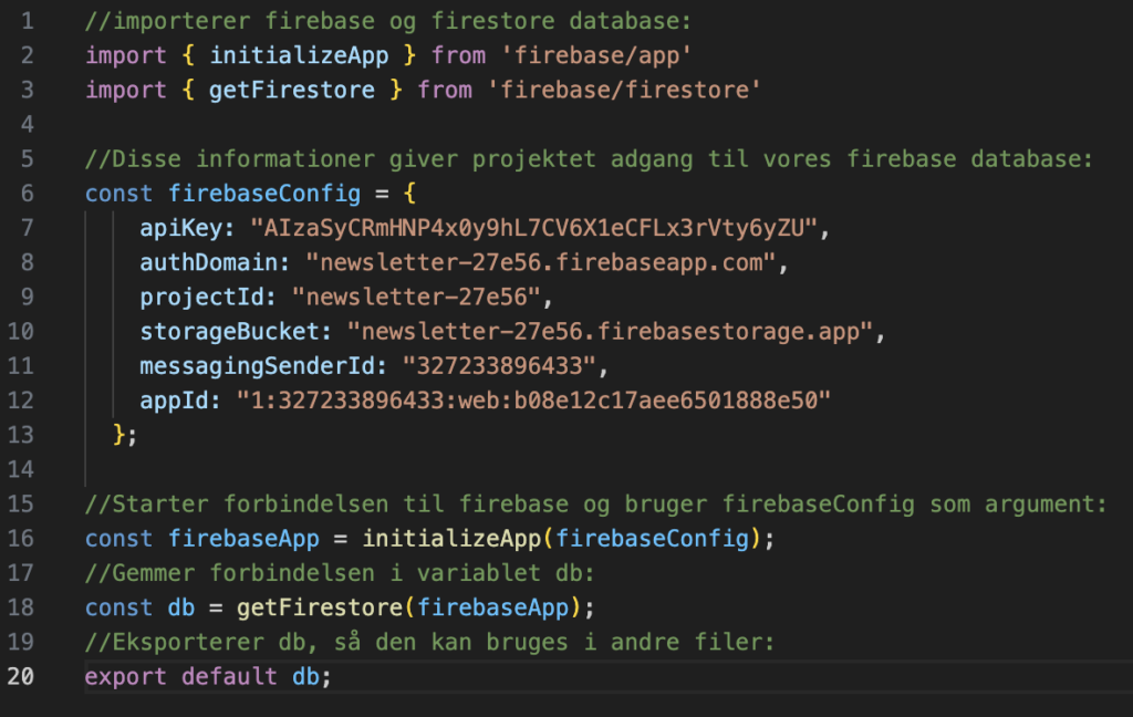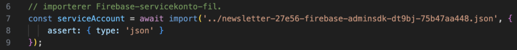 Så det forsøgte jeg at gøre. Jeg startede med at installere min server ved at køre følgende kommando i min terminal: npm install firebase-admin node-fetch. Efter det oprettede jeg en JavaScript-fil ved navn mailchimp.js, som så skulle håndterer alt det kode der stod for at lytte til min database og så kalde API’et til Mailchimp og oprette en ny mail, samt navn og status på min liste i Mailchimp. Denne fil lagde jeg så ind i min src-mappe, inde i rodmappen til mit projekt. For at få dette til at virke skulle jeg også hente en såkaldt servicekonto-fil fra Firebase. Dette var en fil, som ville give min Node.js server adgang til at lytte til min database. Den fik jeg hentet og lagt ind i min projekt-mappe, så jeg kunne importere den i min mailchimp.js fil.