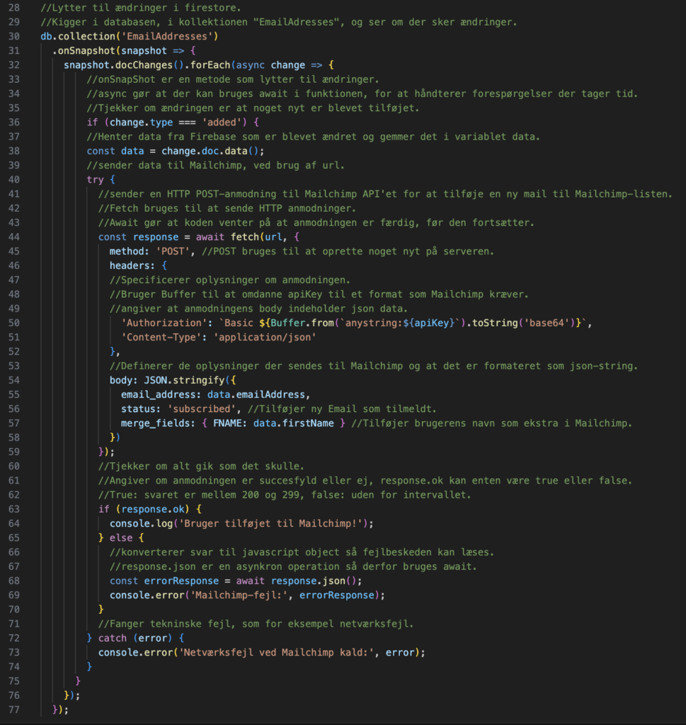 Derudover erklæret jeg også nogle variabler med de nødvendige informationer fra Mailchimp, hvorefter jeg forsøgte at lave en funktion, der til at starte med, går ind og lytter til ændringer i min kollektion i min firestore database, specifikt lytter den til om der bliver tilføjet dokumenter. Her bruger jeg metoderne .onSnapShot() til at lytte til ændringer og .forEach() til at køre gennem dokumenterne i kollektionen.