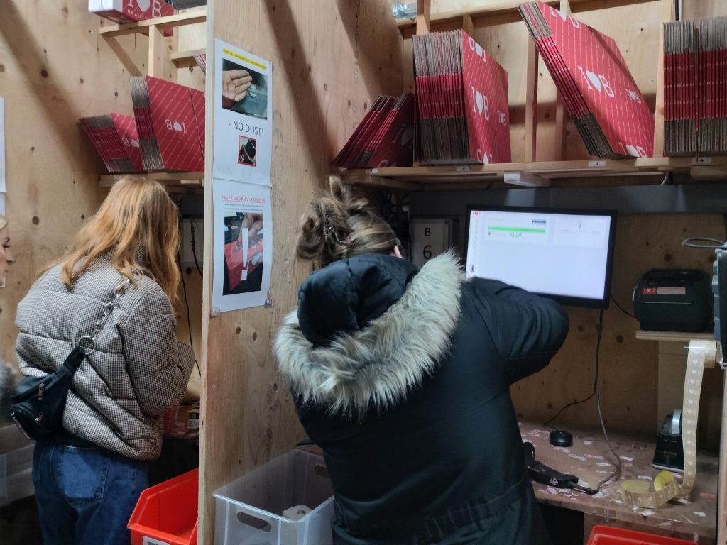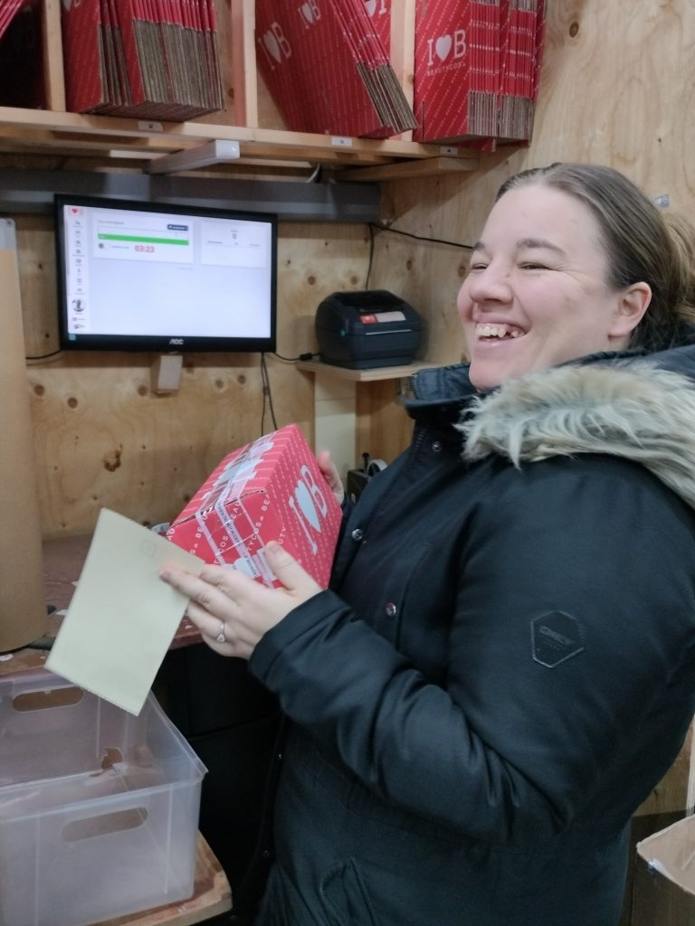 Da vi havde snakket med Michelle og fået alt den information vi skulle bruge til vores præsentation, gik vi hen til pakkestationerne, da vi havde aftalt med ejeren, Henrik, at vi måtte prøve at pakke. Her blev Freya og Lotte vist hvordan man pakkede ordrerne, i mens Laura og jeg tog billeder.